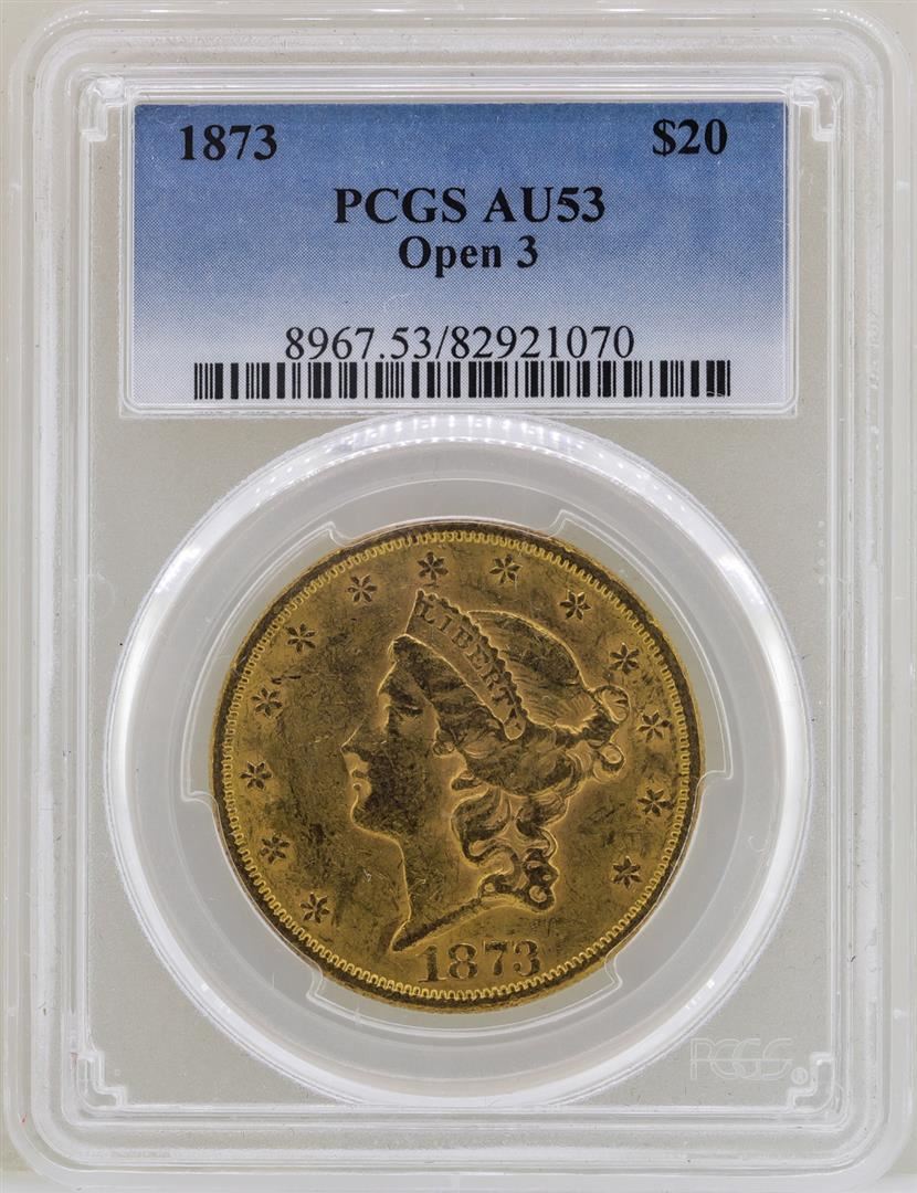 One 1873 Open 3 $20 Liberty Head Double Eagle Gold Coin PCGS AU53. PCGS Graded.