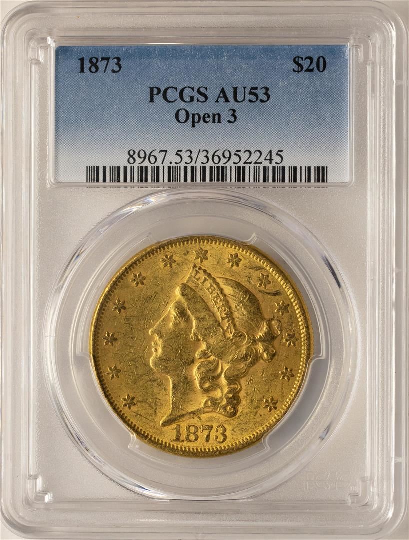 One 1873 Open 3 $20 Liberty Head Double Eagle Gold Coin PCGS AU53. PCGS Graded.