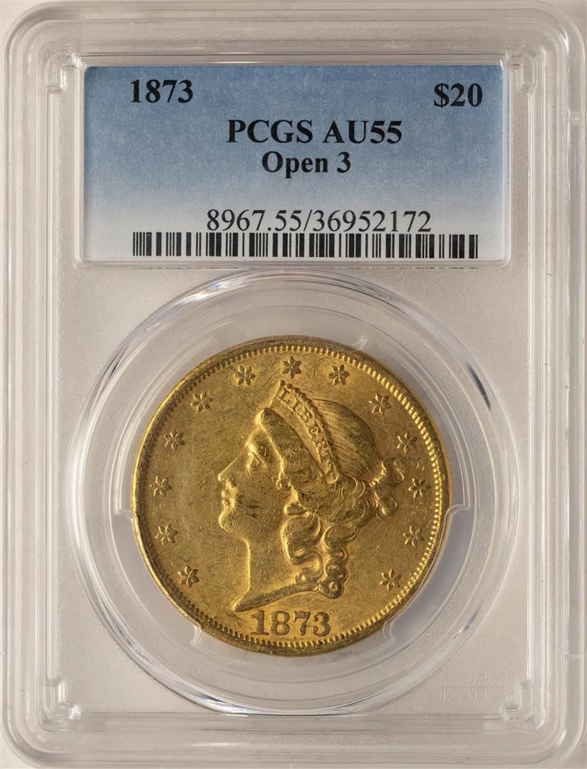 One 1873 Open 3 $20 Liberty Head Double Eagle Gold Coin PCGS AU55. PCGS Graded.