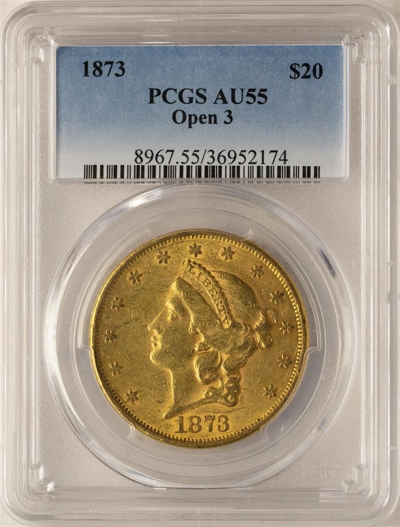 One 1873 Open 3 $20 Liberty Head Double Eagle Gold Coin PCGS AU55. PCGS Graded.