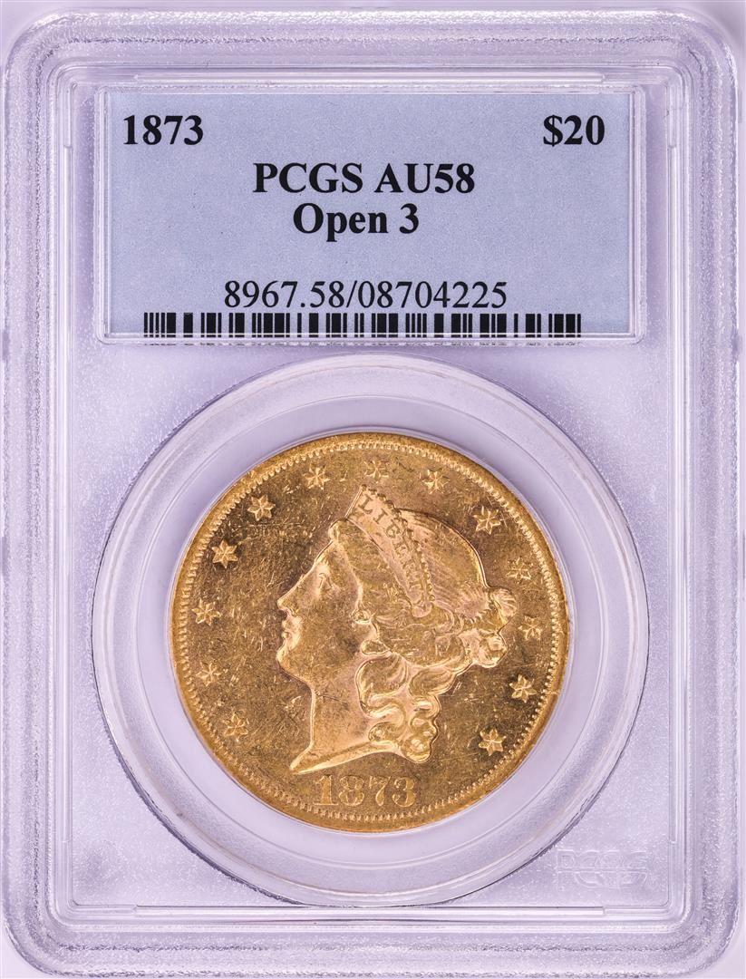 One 1873 Open 3 $20 Liberty Head Double Eagle Gold Coin PCGS AU58. PCGS Graded.