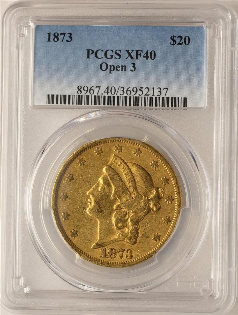 One 1873 Open 3 $20 Liberty Head Double Eagle Gold Coin PCGS XF40. PCGS Graded.