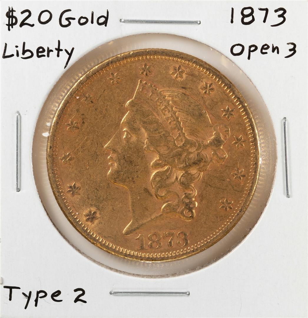 One 1873 Open 3 $20 Liberty Head Double Eagle Gold Coin.