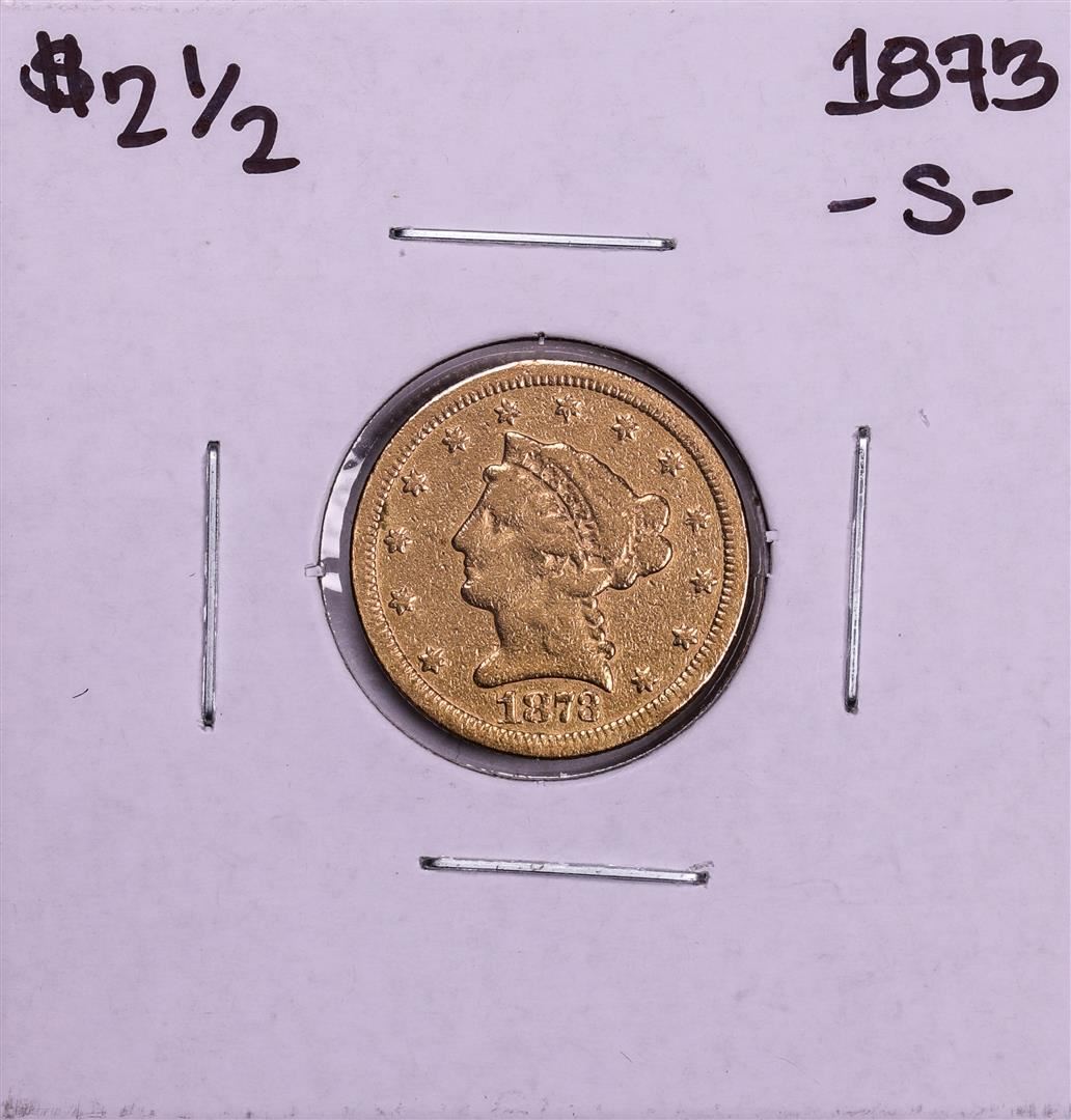 One 1873-S $2 1/2 Liberty Head Quarter Eagle Gold Coin.