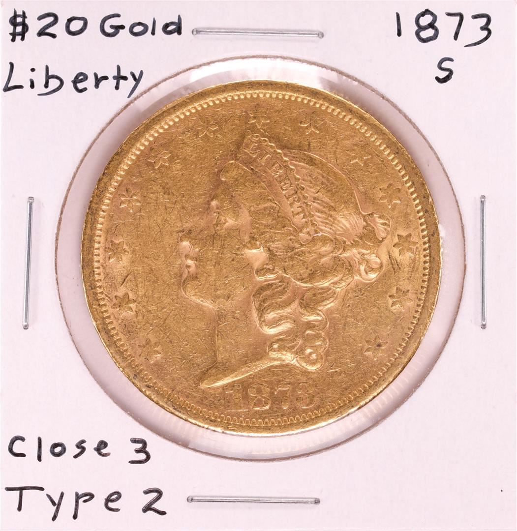 One 1873-S $20 Closed 3 Type 2 Liberty Head Double Eagle Gold Coin.