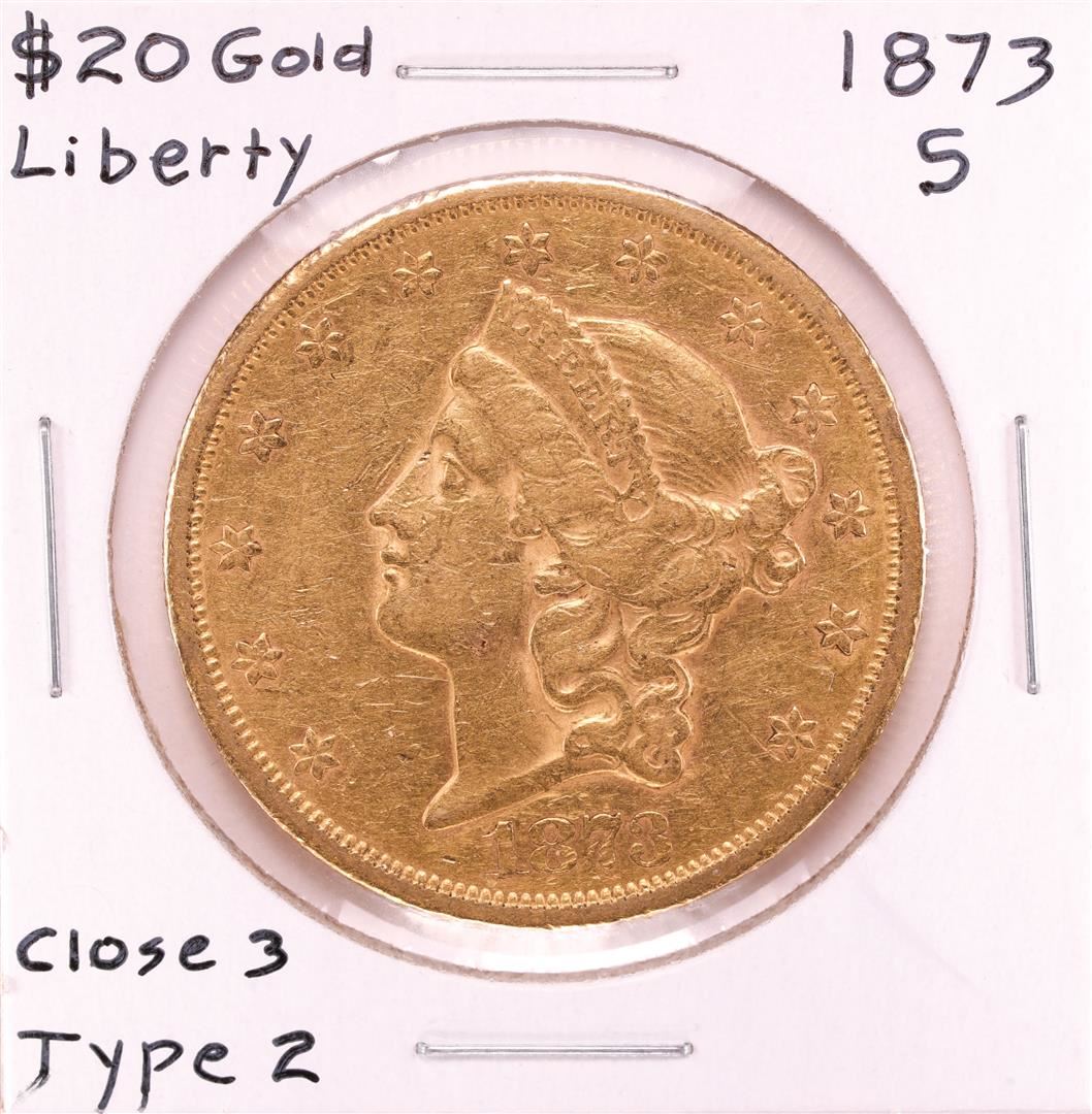 One 1873-S $20 Open 3 Type 2 Liberty Head Double Eagle Gold Coin.