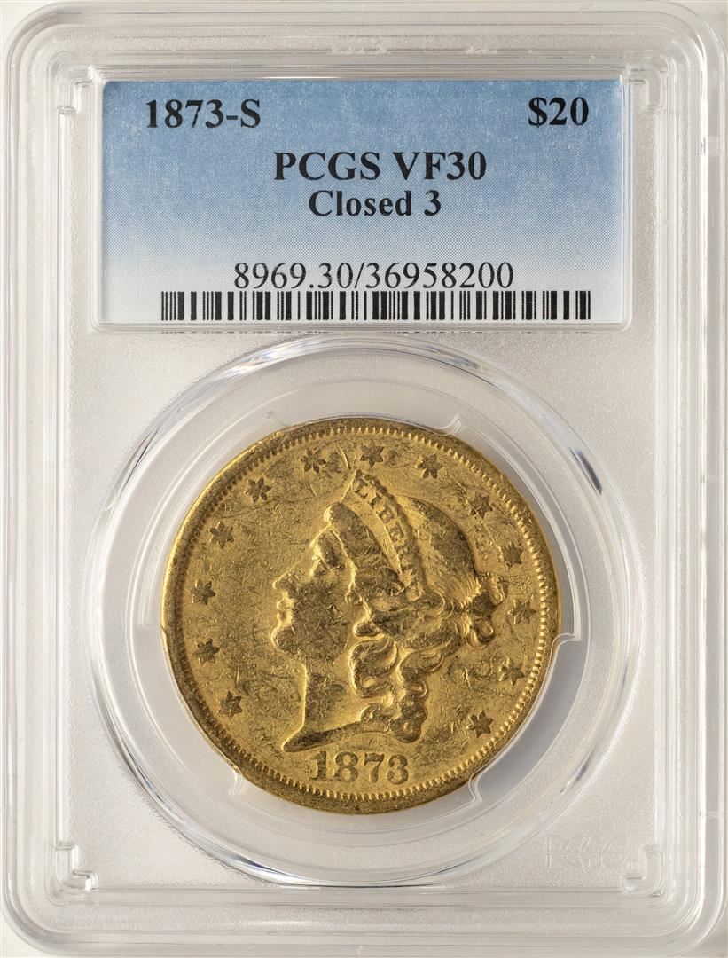 One 1873-S Closed 3 $20 Liberty Head Double Eagle Gold Coin PCGS VF30. PCGS Graded.