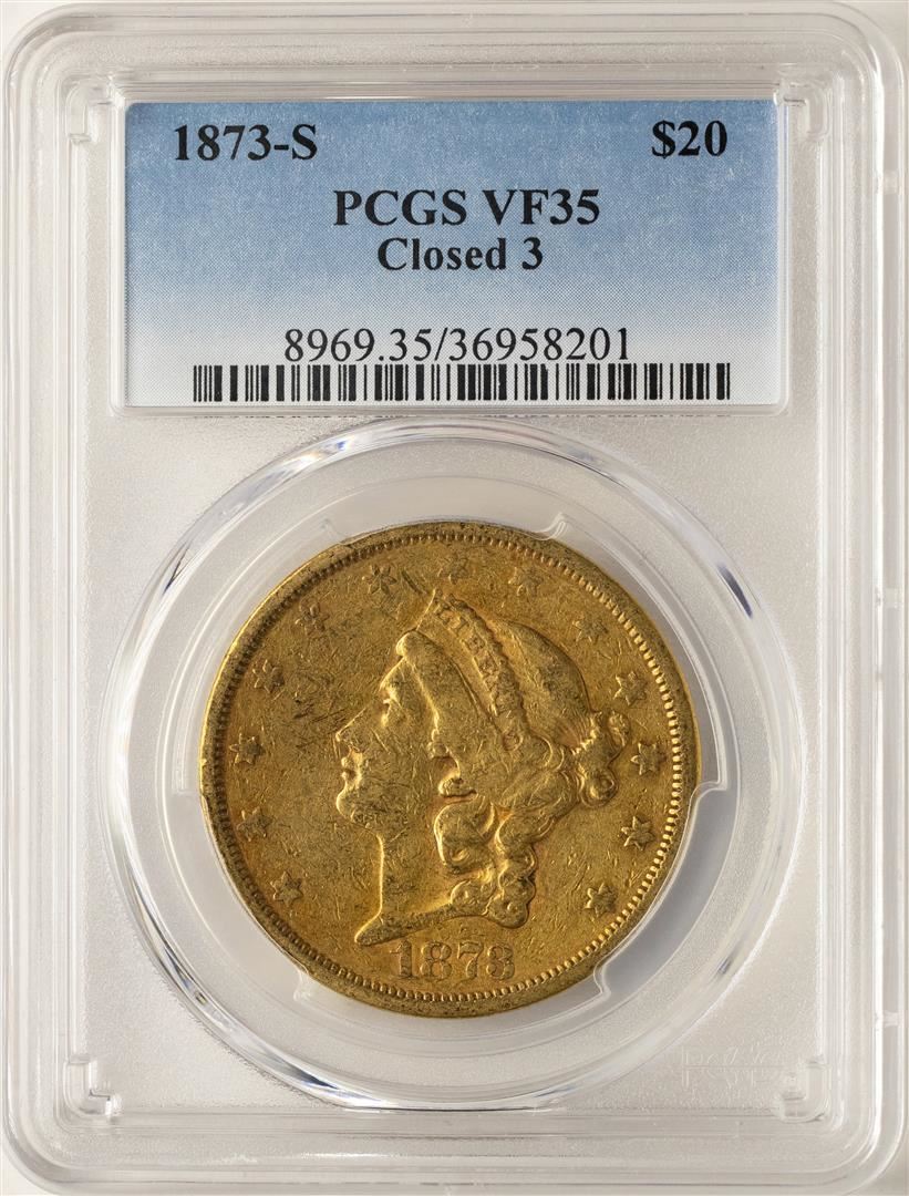 One 1873-S Closed 3 $20 Liberty Head Double Eagle Gold Coin PCGS VF35. PCGS Graded.