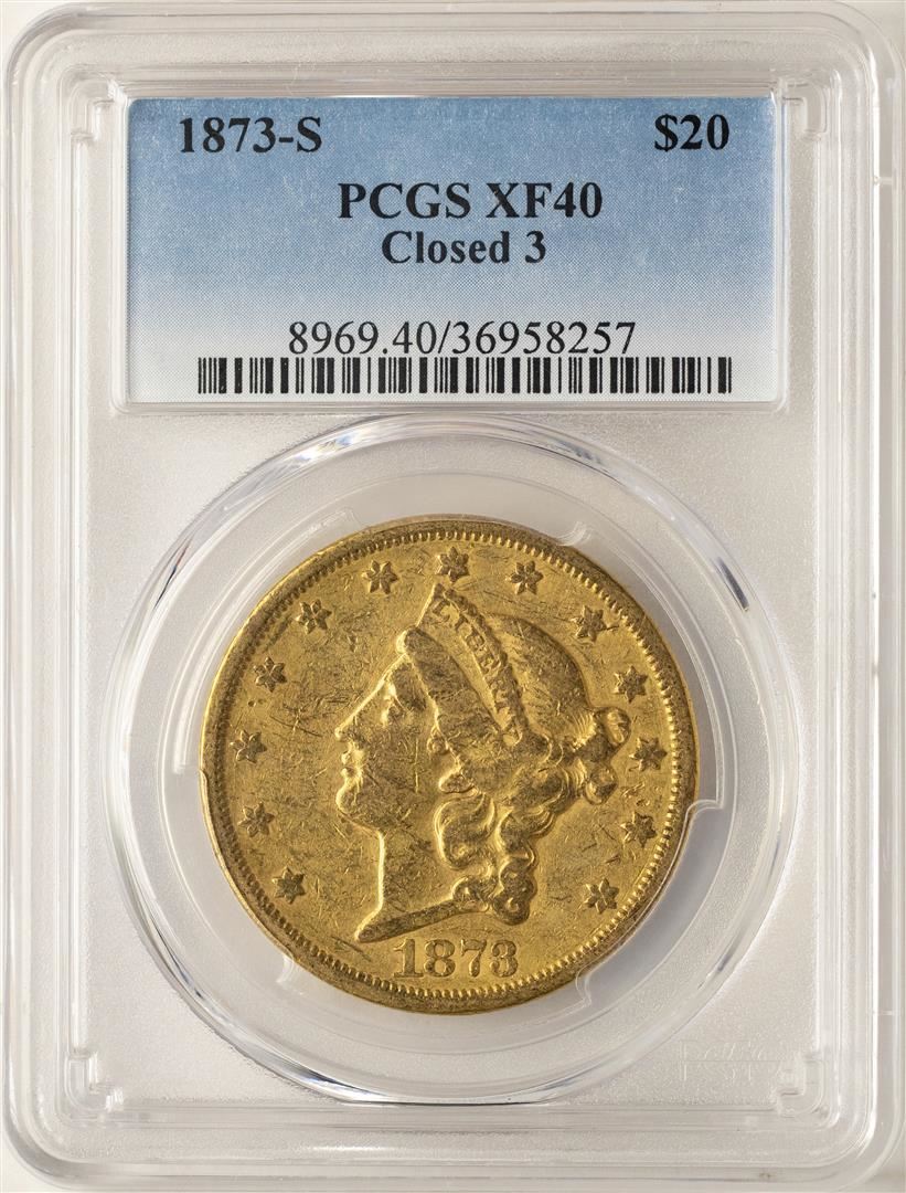 One 1873-S Closed 3 $20 Liberty Head Double Eagle Gold Coin PCGS XF40. PCGS Graded.