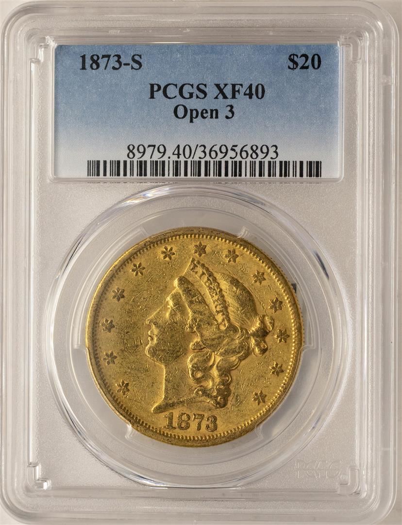 One 1873-S Open 3 $20 Liberty Head Double Eagle Gold Coin PCGS XF40. PCGS Graded.