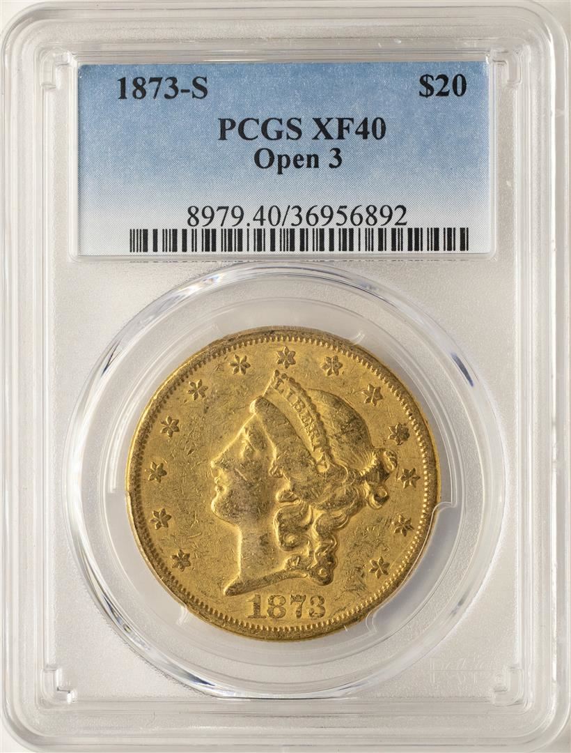 One 1873-S Open 3 $20 Liberty Head Double Eagle Gold Coin PCGS XF40. PCGS Graded.