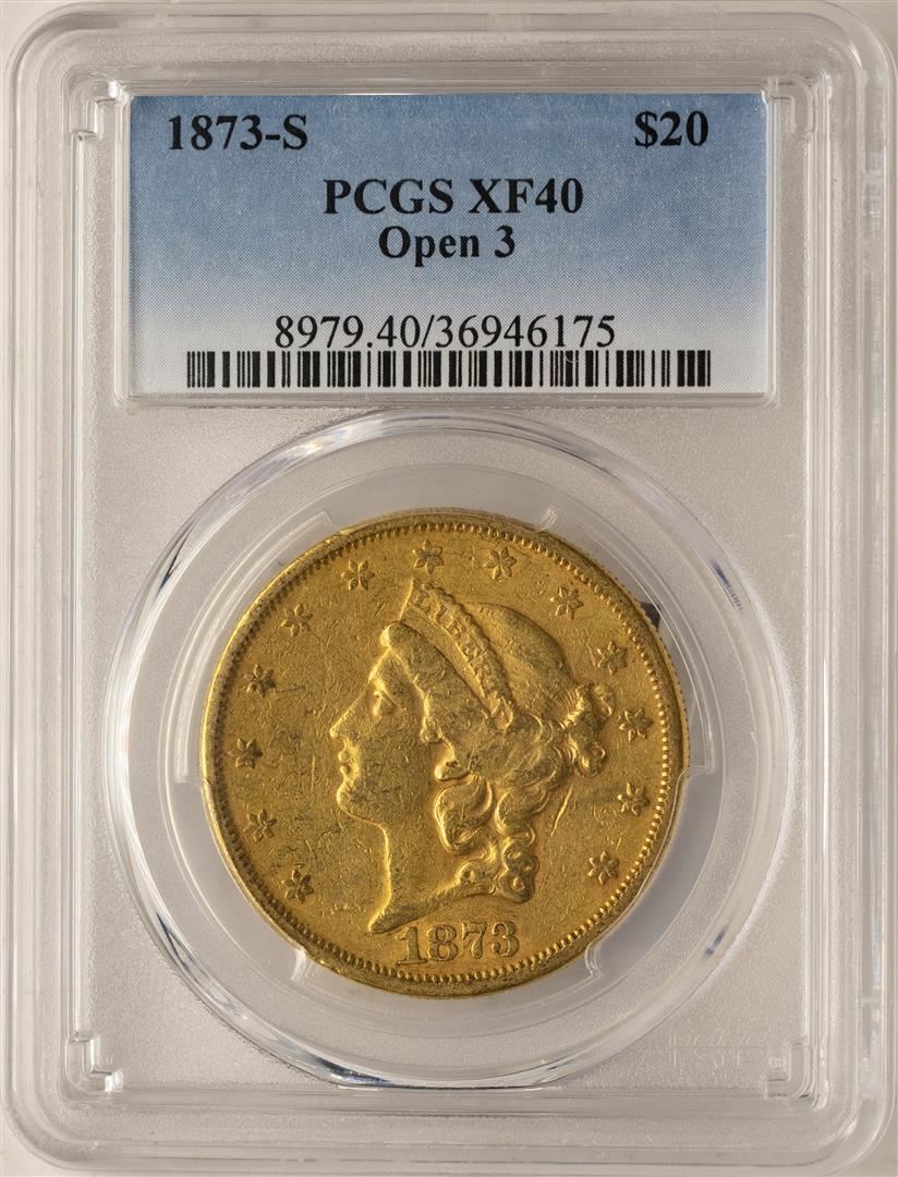 One 1873-S Open 3 $20 Liberty Head Double Eagle Gold Coin PCGS XF40. PCGS Graded.