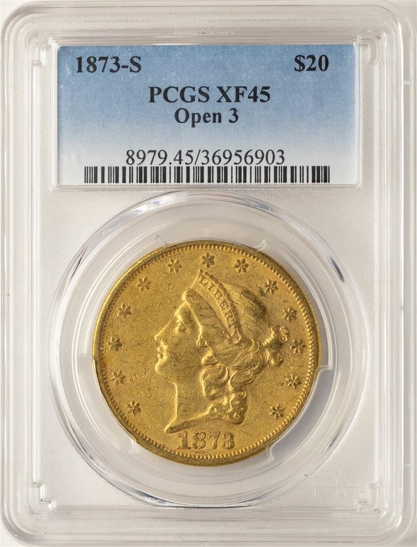 One 1873-S Open 3 $20 Liberty Head Double Eagle Gold Coin PCGS XF45. PCGS Graded.