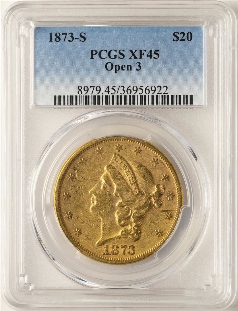 One 1873-S Open 3 $20 Liberty Head Double Eagle Gold Coin PCGS XF45. PCGS Graded.