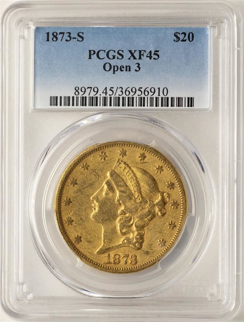 One 1873-S Open 3 $20 Liberty Head Double Eagle Gold Coin PCGS XF45. PCGS Graded.
