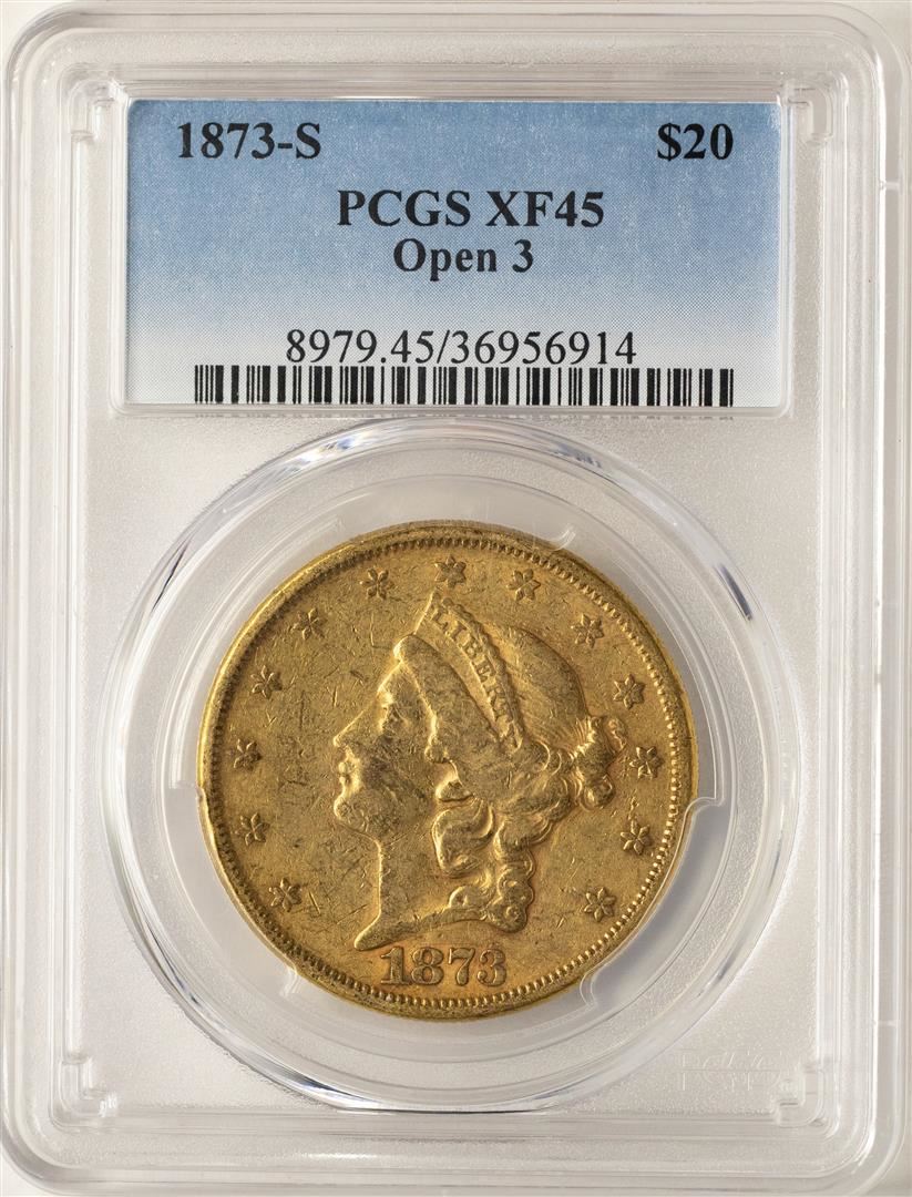 One 1873-S Open 3 $20 Liberty Head Double Eagle Gold Coin PCGS XF45. PCGS Graded.