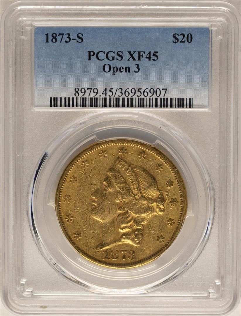 One 1873-S Open 3 $20 Liberty Head Double Eagle Gold Coin PCGS XF45. PCGS Graded.