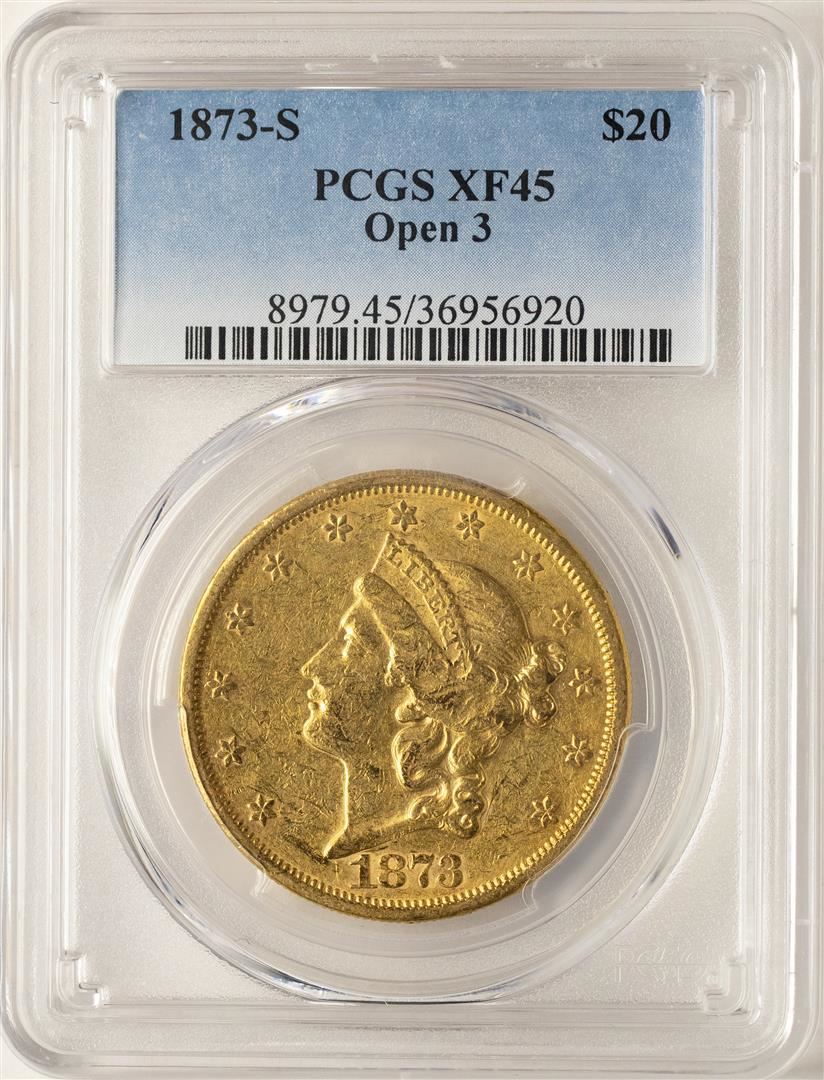One 1873-S Open 3 $20 Liberty Head Double Eagle Gold Coin PCGS XF45. PCGS Graded.