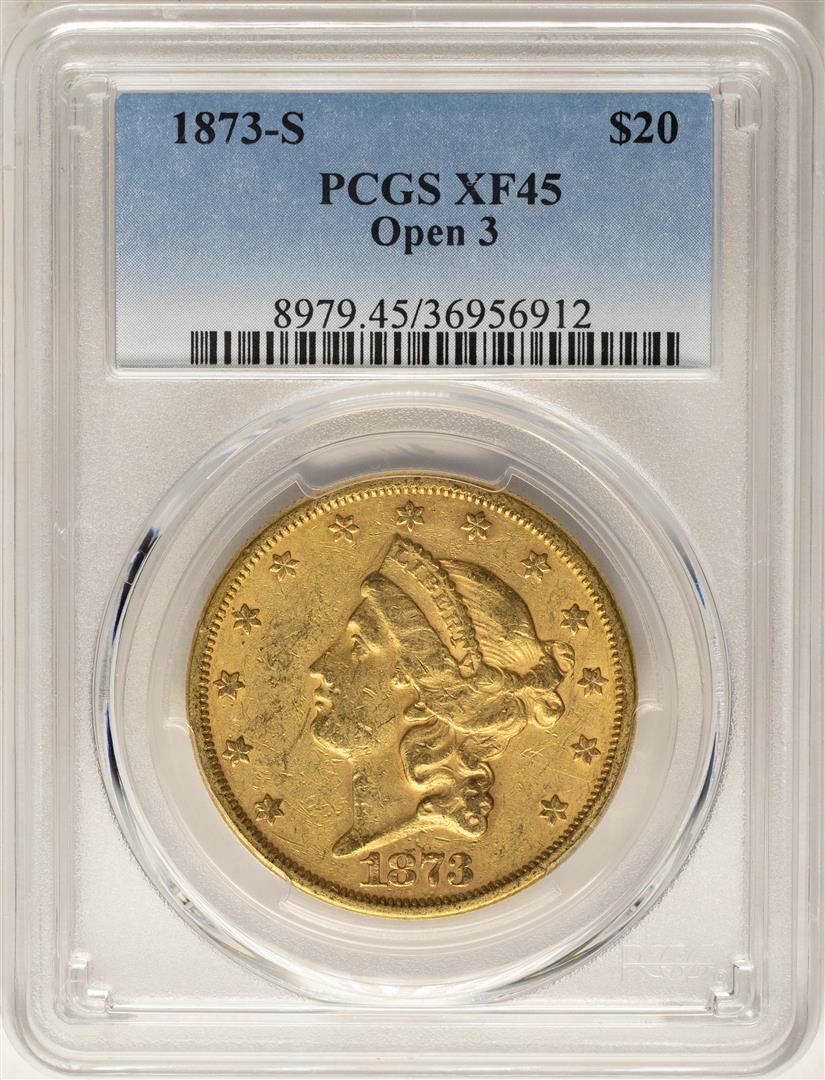 One 1873-S Open 3 $20 Liberty Head Double Eagle Gold Coin PCGS XF45. PCGS Graded.