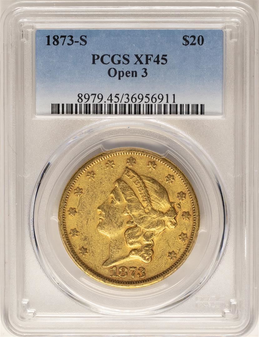 One 1873-S Open 3 $20 Liberty Head Double Eagle Gold Coin PCGS XF45. PCGS Graded.