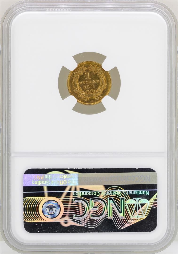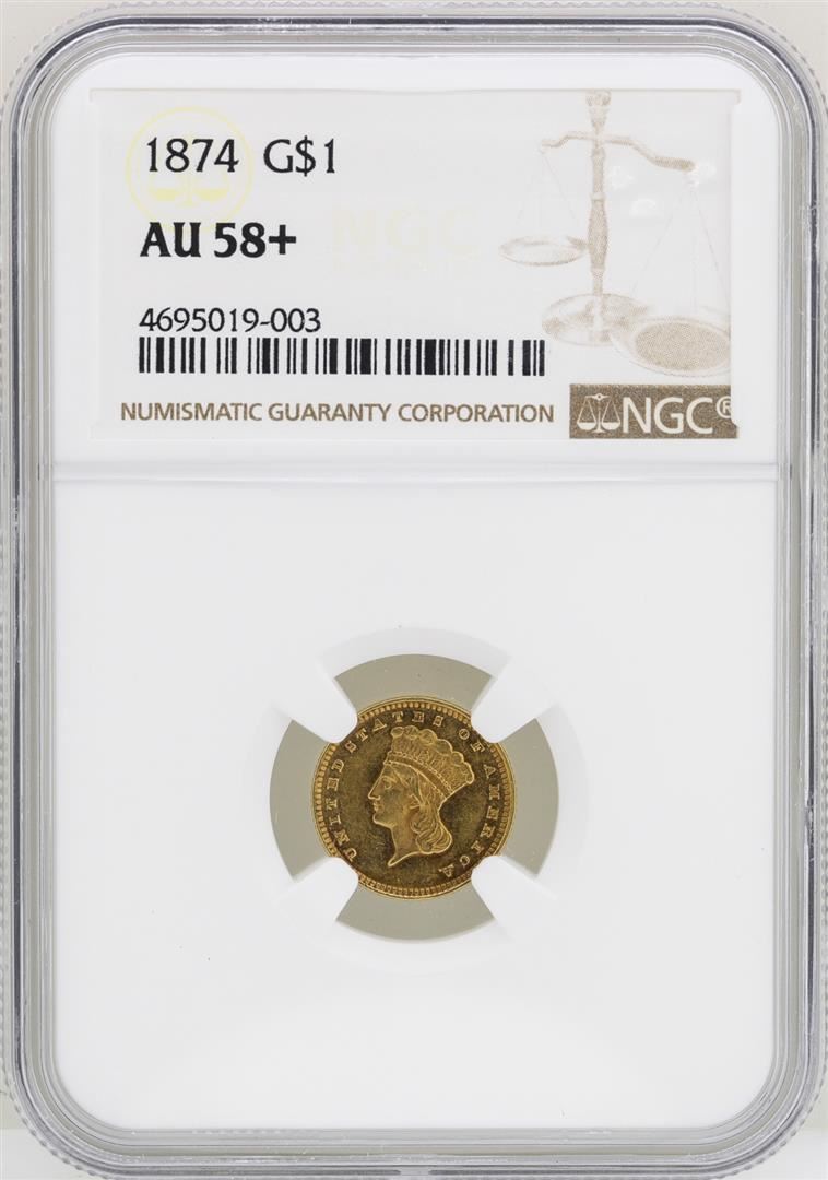 One 1874 $1 Indian Princess Head Gold Dollar Coin NGC AU58+. NGC Certified.