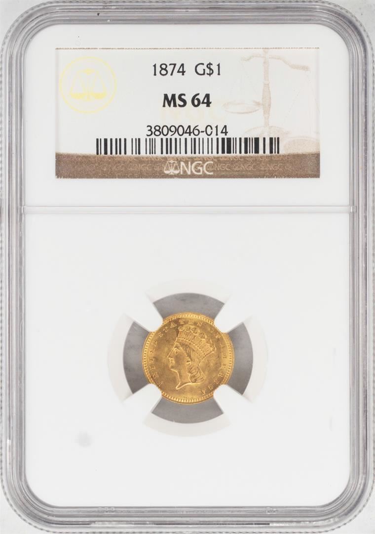 One 1874 $1 Indian Princess Head Gold Dollar Coin NGC MS64. NGC Certified.