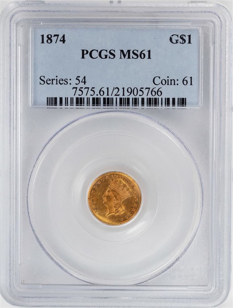 One 1874 $1 Indian Princess Head Gold Dollar Coin PCGS MS61. PCGS Graded.