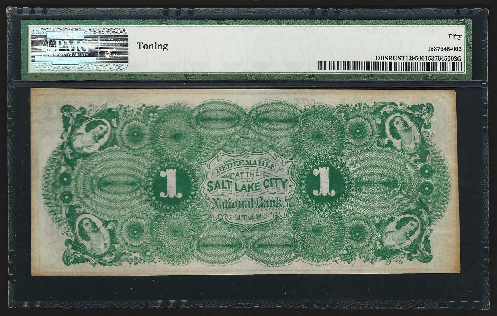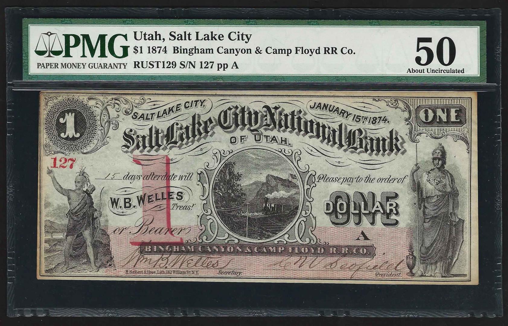 One 1874 $1 Salt Lake City Bingham Canyon & Camp Floyd Obsolete Bank Note PMG AU50. PMG Certified.