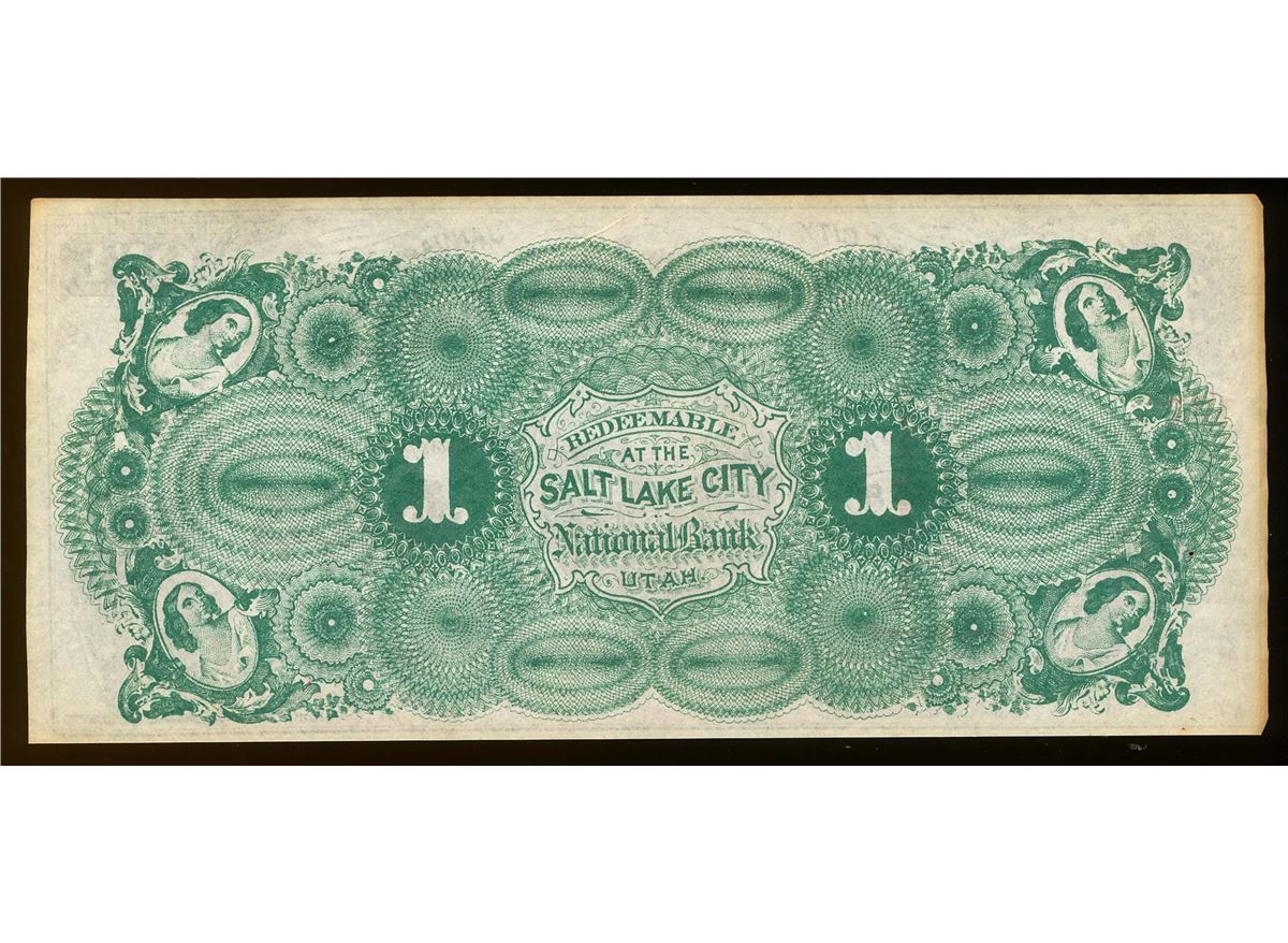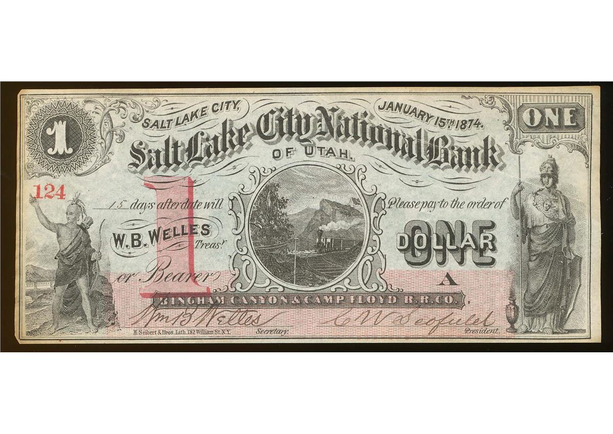 One 1874 $1 Salt Lake City National Bank Obsolete Bank Note. A rare note from a rare issue and also the first of this issue that we have offered in our auctions. It is serial number 124-A and this post note possesses authentic penned signatures of Secretary Welles and President Scofield as pictured on pages 179 and 186 of the Nyholm reference. This is a great piece of history and would make a great addition to any collection.
