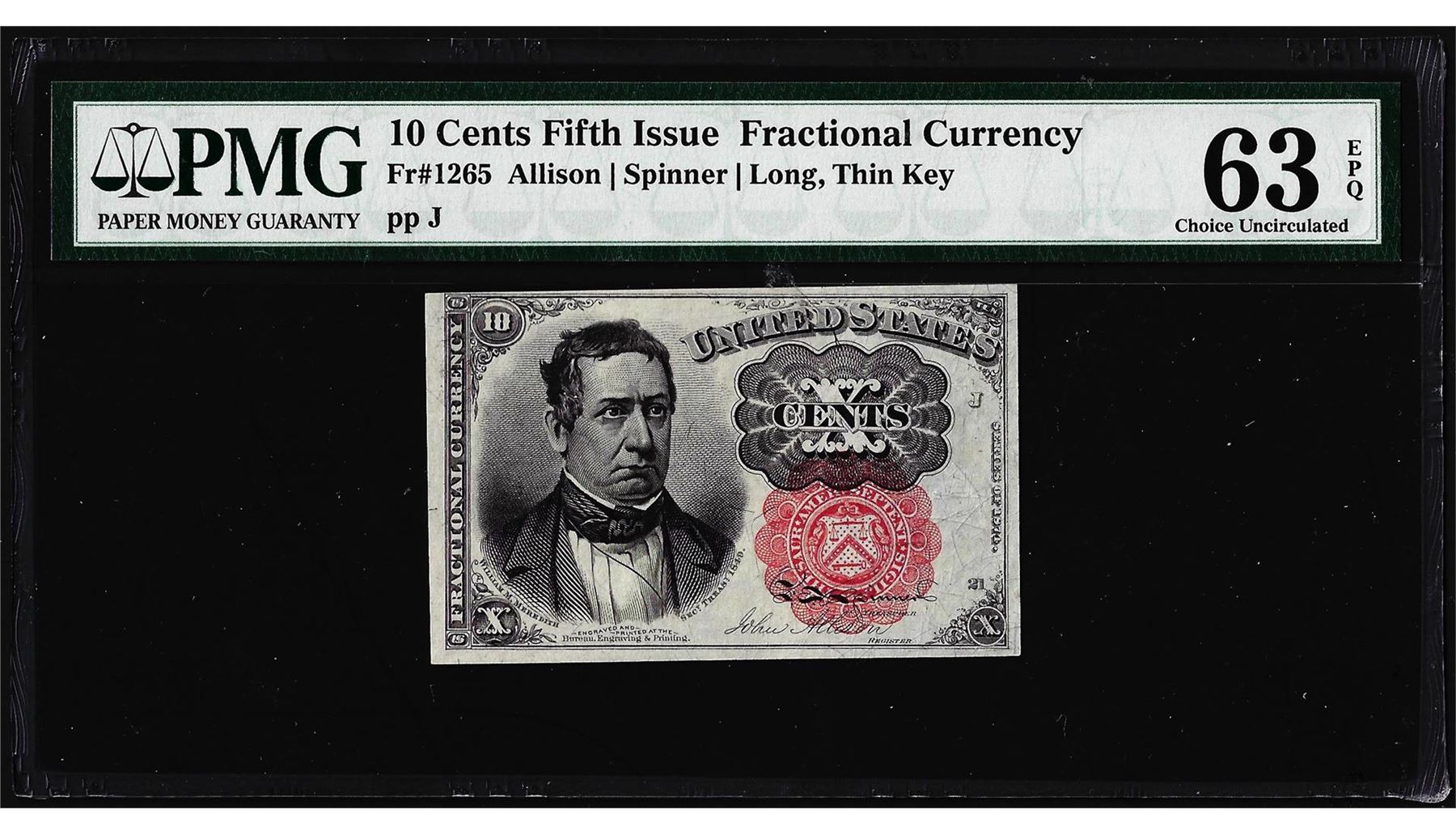 One 1874 10 Cent Fifth Issue Fractional Currency Note Fr.1265 PMG Choice Uncirculated 63EPQ. PMG Certified.