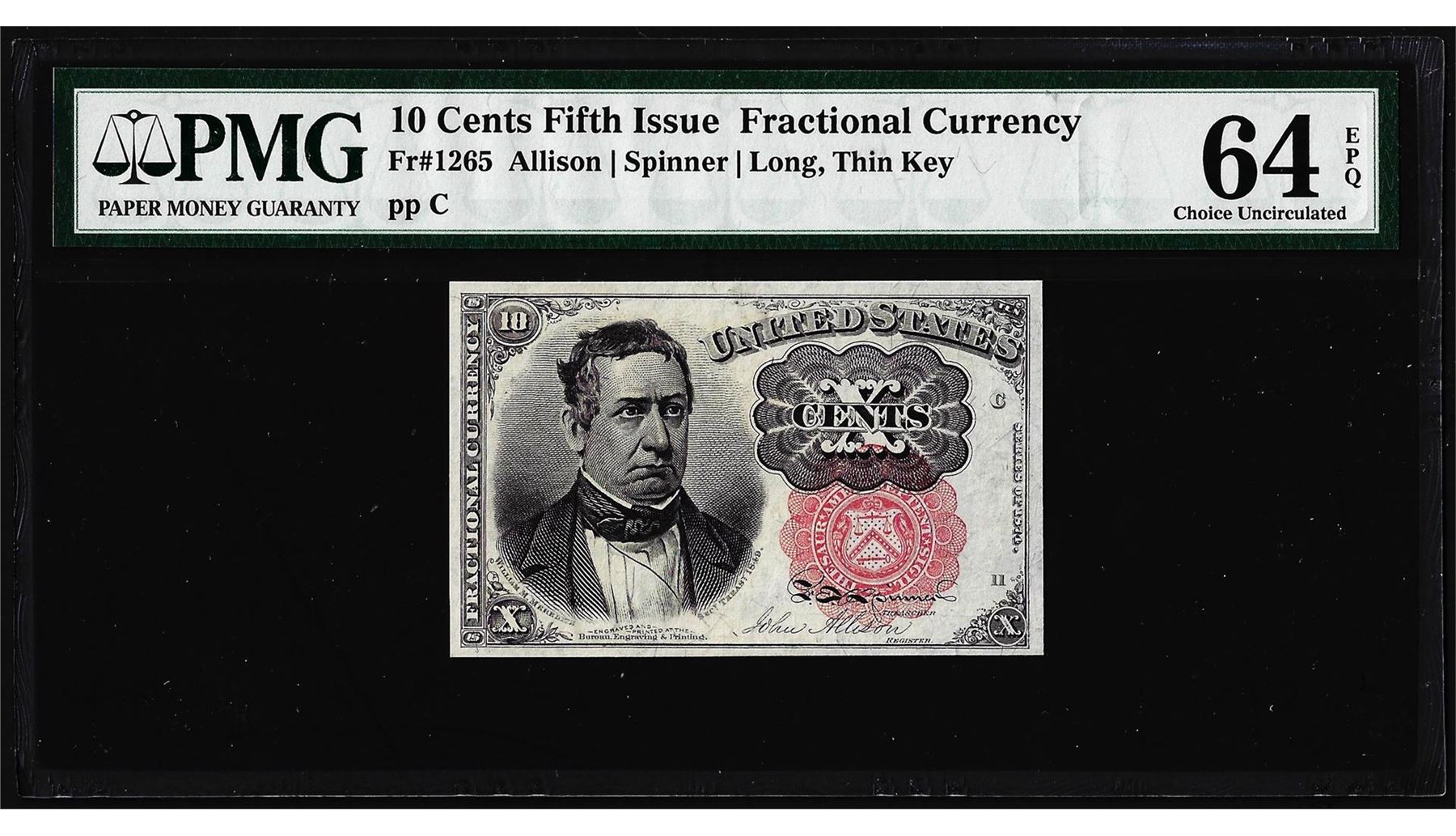 One 1874 10 Cent Fifth Issue Fractional Currency Note Fr.1265 PMG Choice Uncirculated 64EPQ. PMG Certified.