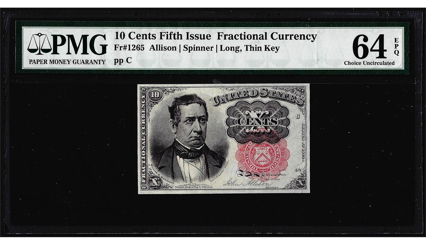 One 1874 10 Cent Fifth Issue Fractional Currency Note Fr.1265 PMG Choice Uncirculated 64EPQ. PMG Certified.
