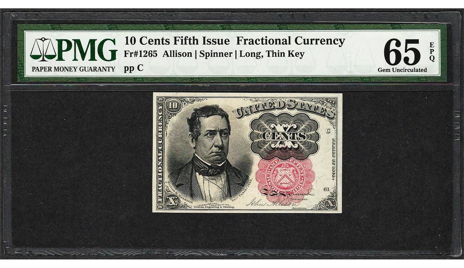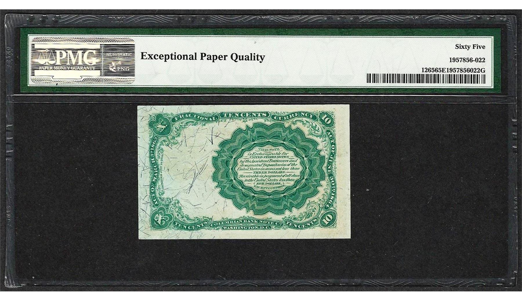 One 1874 10 Cent Fifth Issue Fractional Currency Note Fr.1265 PMG Gem Uncirculated 65EPQ. PMG Certified.