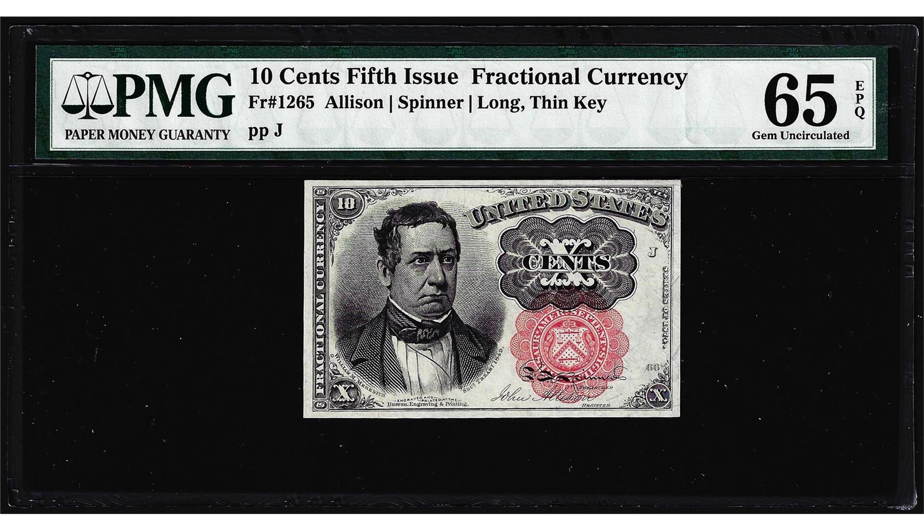 One 1874 10 Cent Fifth Issue Fractional Currency Note Fr.1265 PMG Gem Uncirculated 65EPQ. PMG Certified.