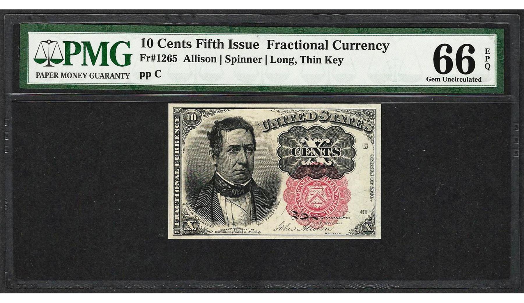 One 1874 10 Cent Fifth Issue Fractional Currency Note Fr.1265 PMG Gem Uncirculated 66EPQ. PMG Certified.