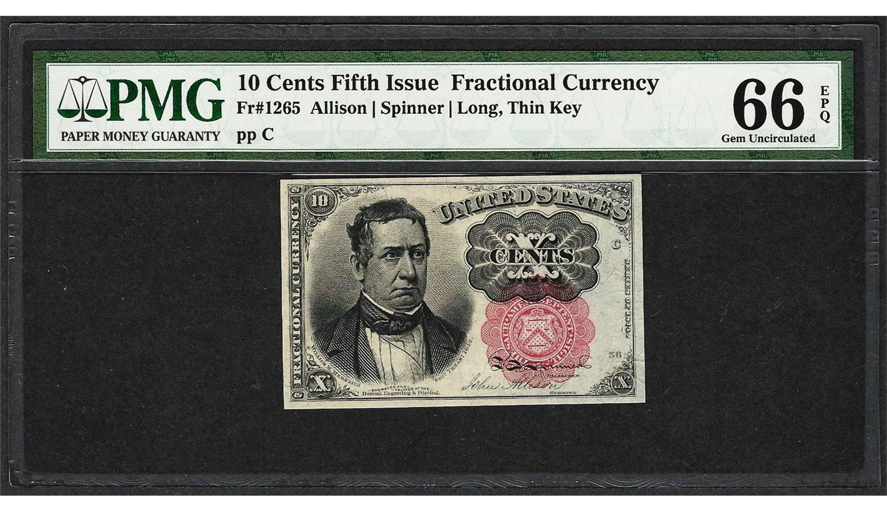 One 1874 10 Cent Fifth Issue Fractional Currency Note Fr.1265 PMG Gem Uncirculated 66EPQ. PMG Certified.