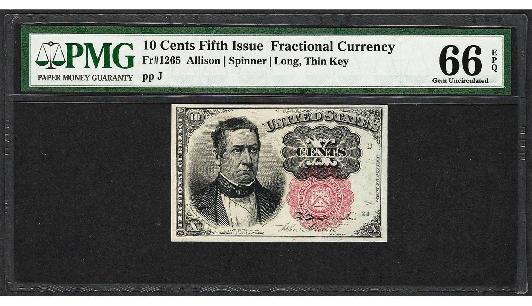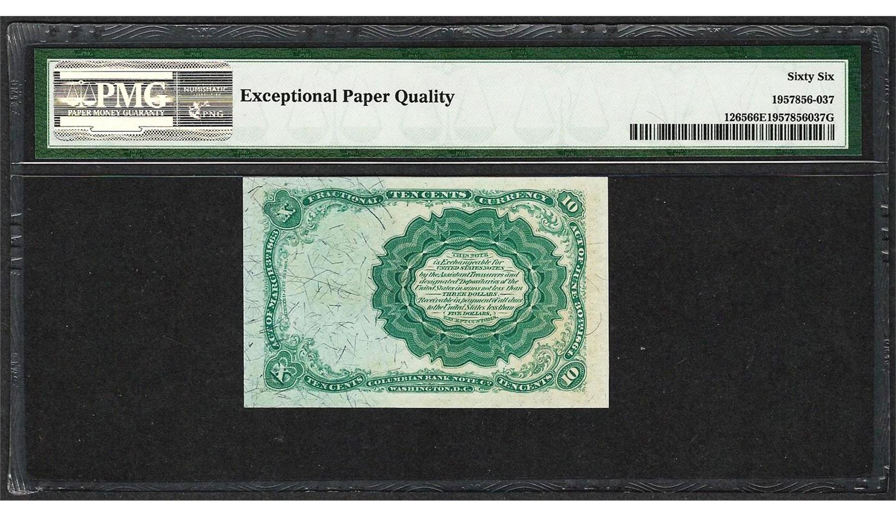 One 1874 10 Cent Fifth Issue Fractional Currency Note Fr.1265 PMG Gem Uncirculated 66EPQ. PMG Certified.