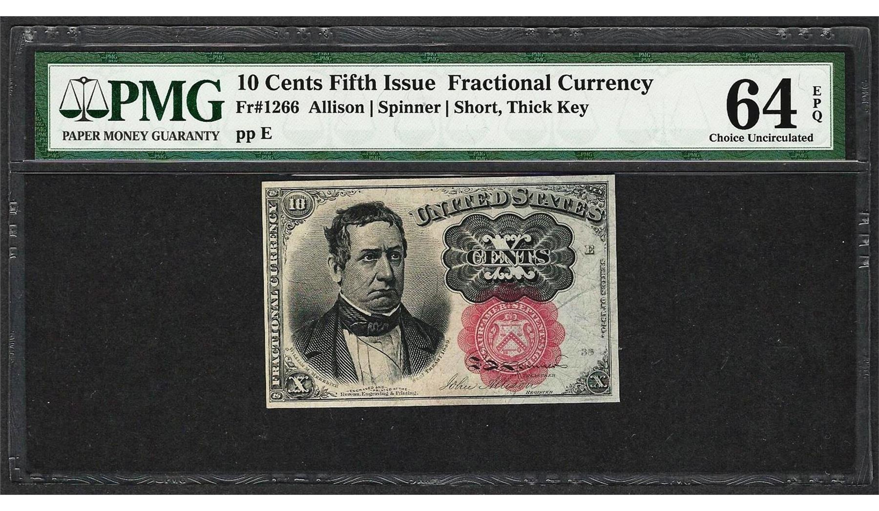 One 1874 10 Cent Fifth Issue Fractional Currency Note Fr.1266 PMG Choice Uncirculated 64EPQ. PMG Certified.