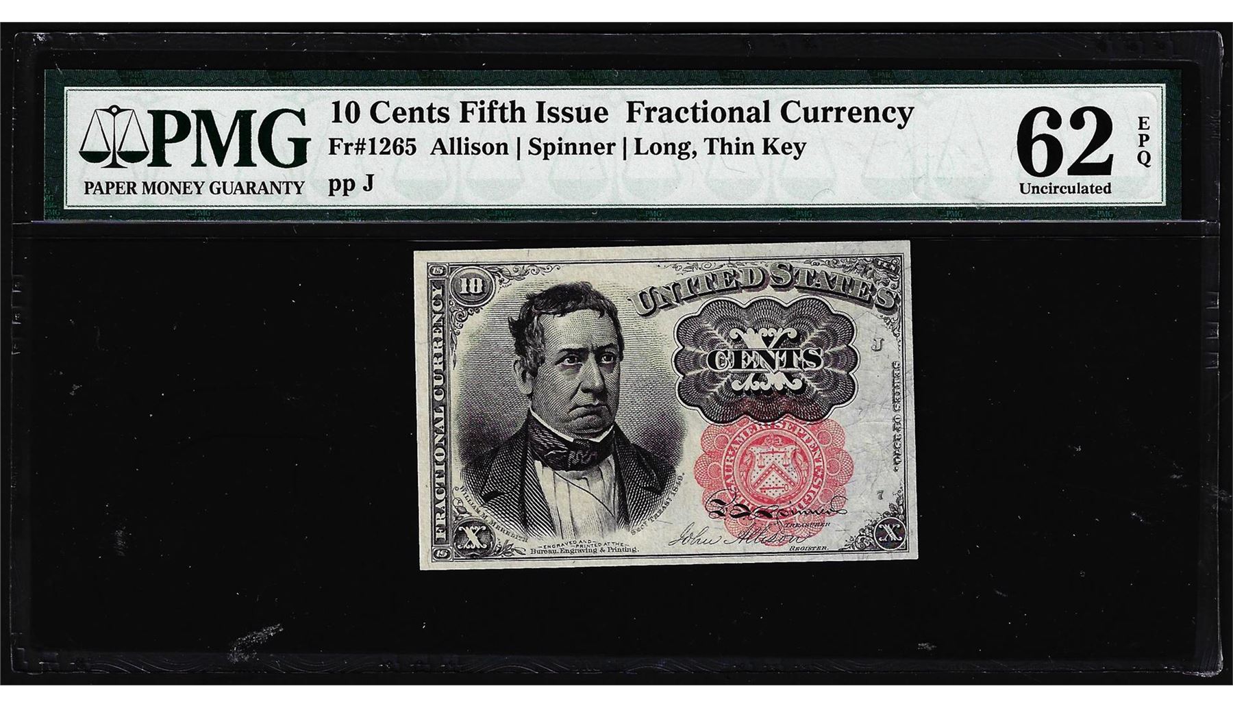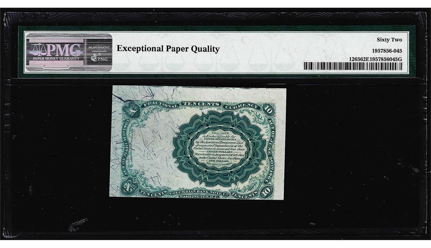 One 1874 10 Cent Fifth Issue Fractional Currency Note Fr.1266 PMG Uncirculated 62EPQ. PMG Certified.