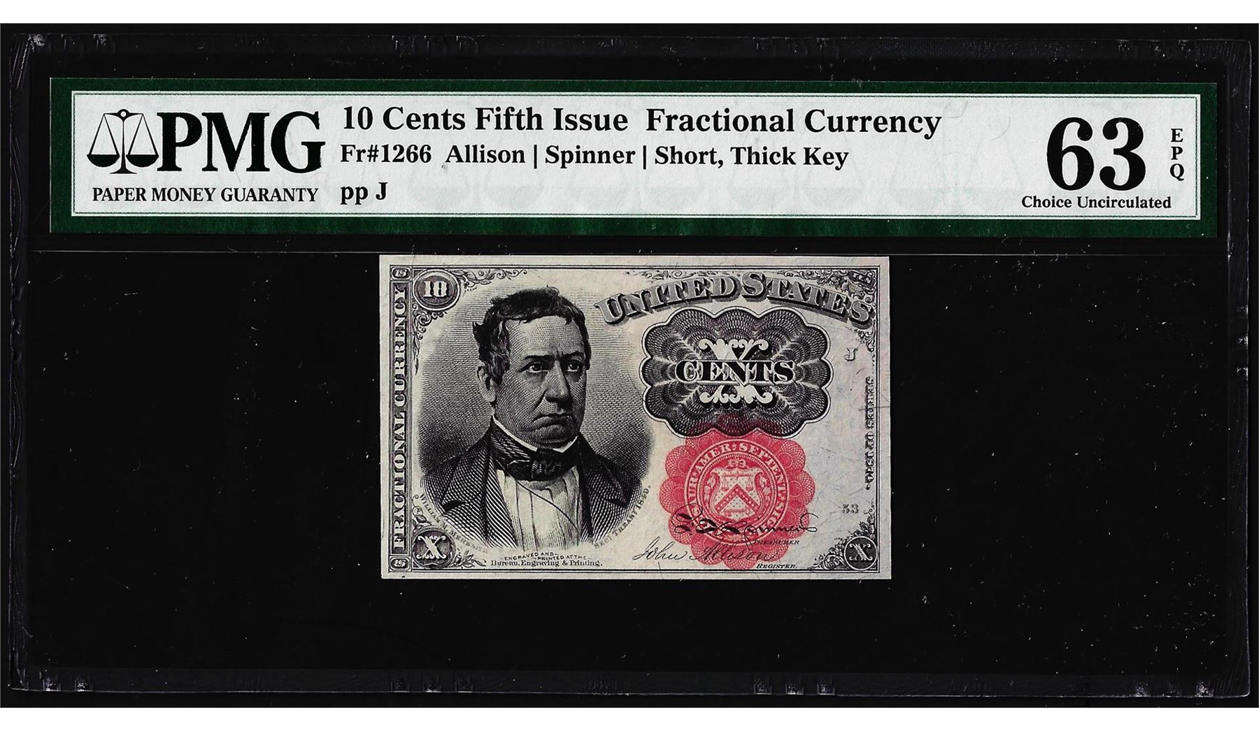 One 1874 10 Cents Fifth Issue Fractional Currency Note Fr.1266 PMG Choice Unc. 63EPQ. PMG Certified.