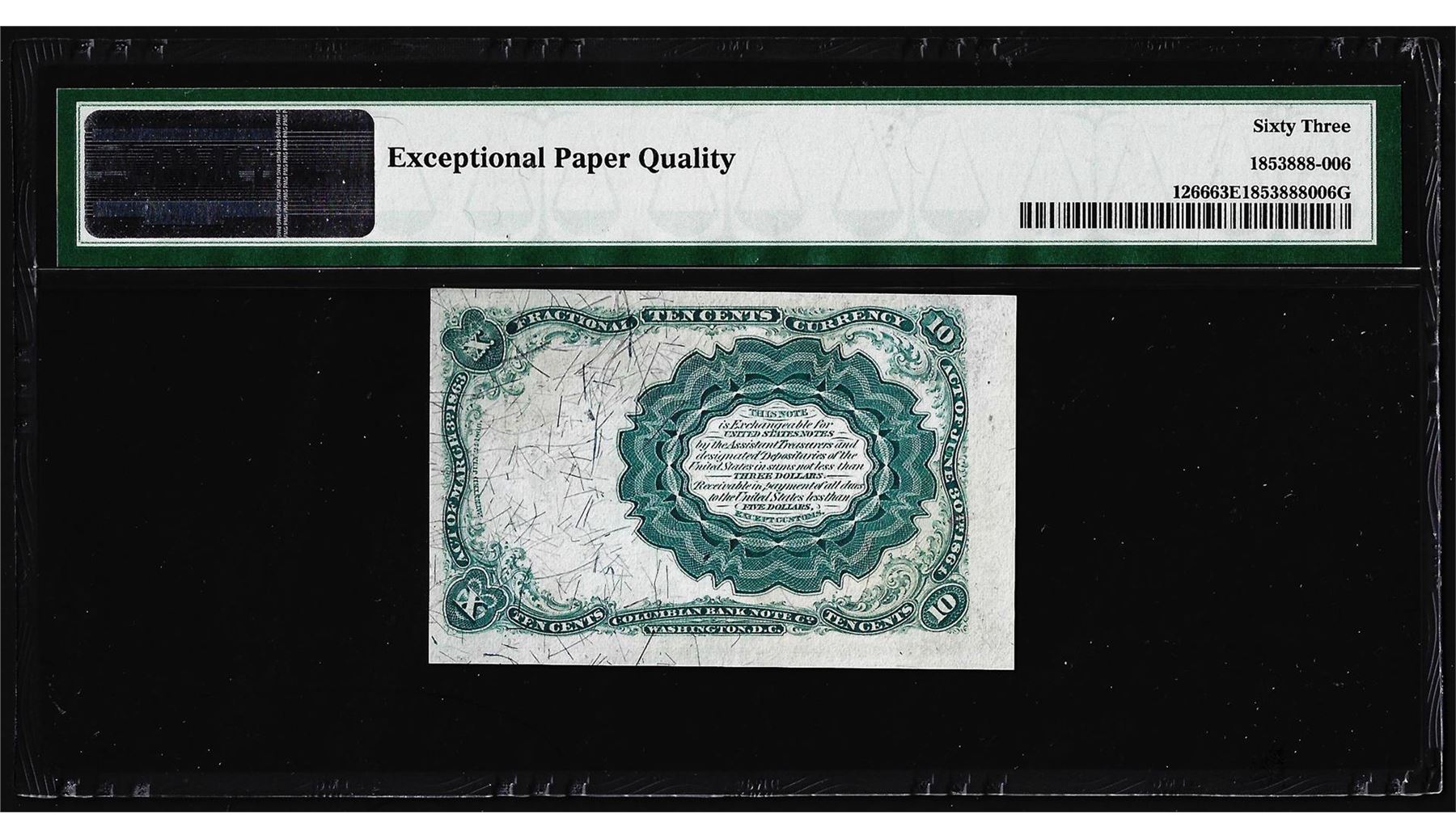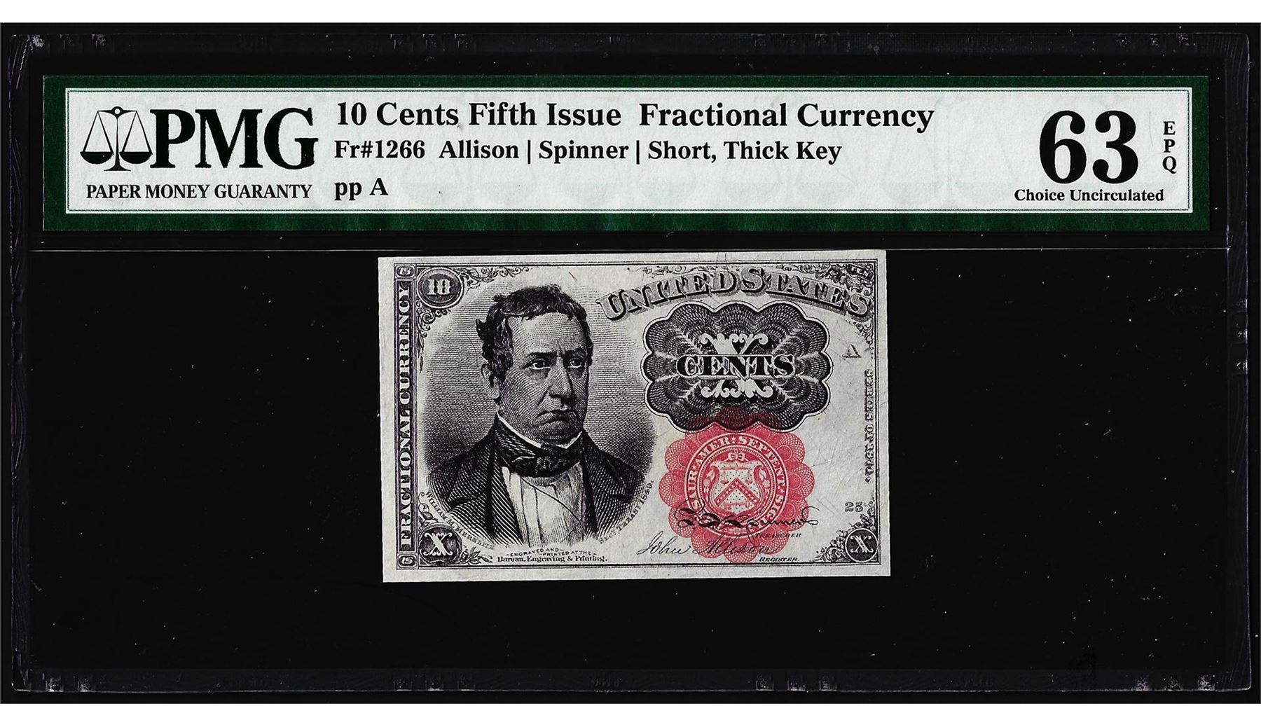 One 1874 10 Cents Fifth Issue Fractional Currency Note Fr.1266 PMG Choice Unc. 63EPQ. PMG Certified.