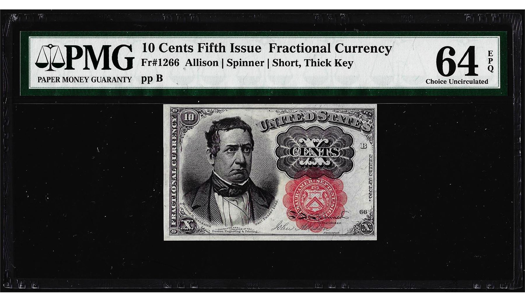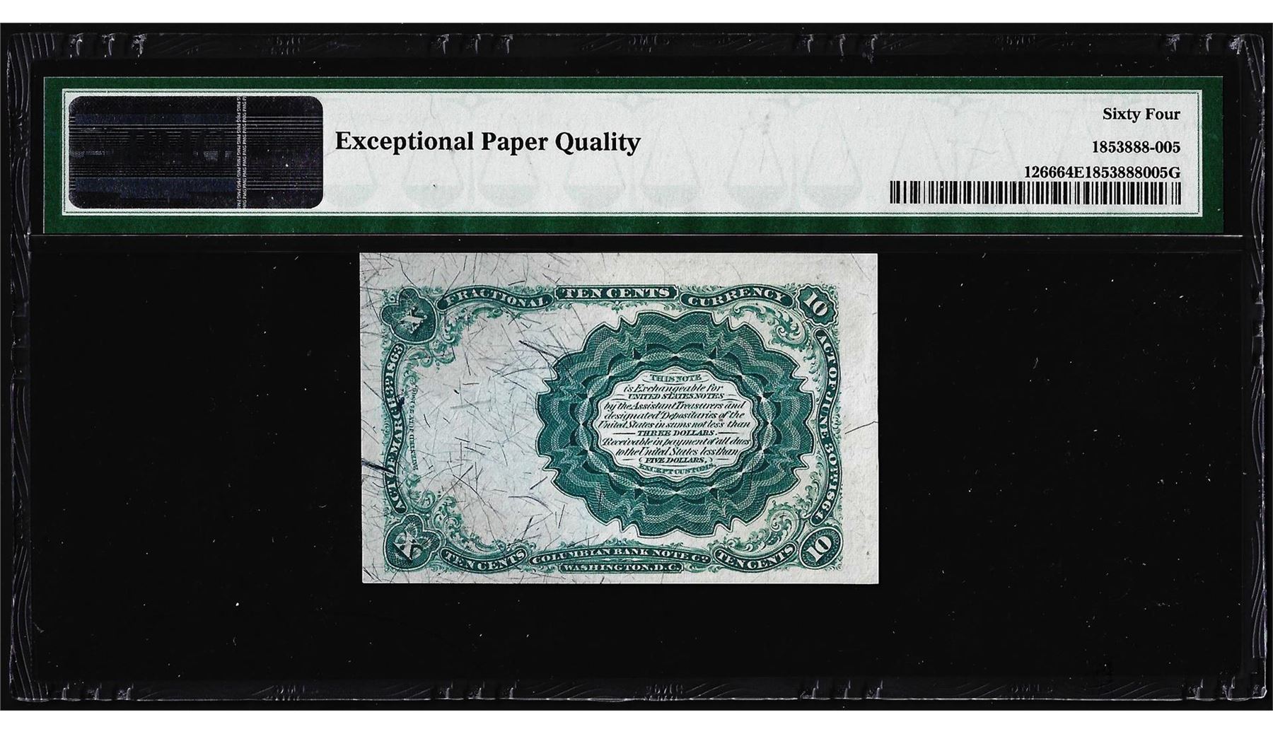 One 1874 10 Cents Fifth Issue Fractional Currency Note Fr.1266 PMG Choice Unc. 64EPQ. PMG Certified.
