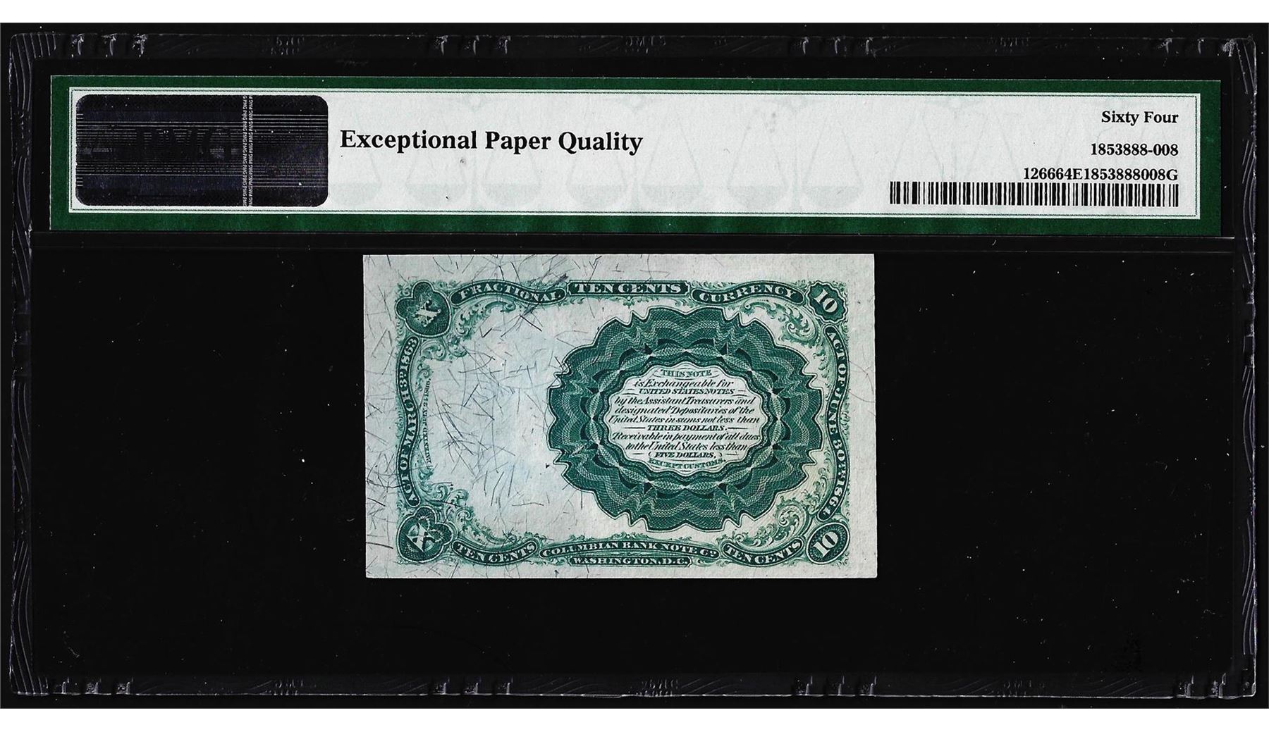 One 1874 10 Cents Fifth Issue Fractional Currency Note Fr.1266 PMG Choice Unc. 64EPQ. PMG Certified.