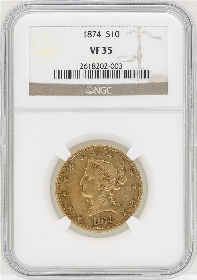 One 1874 $10 Liberty Head Eagle Gold Coin NGC VF35. NGC Certified.