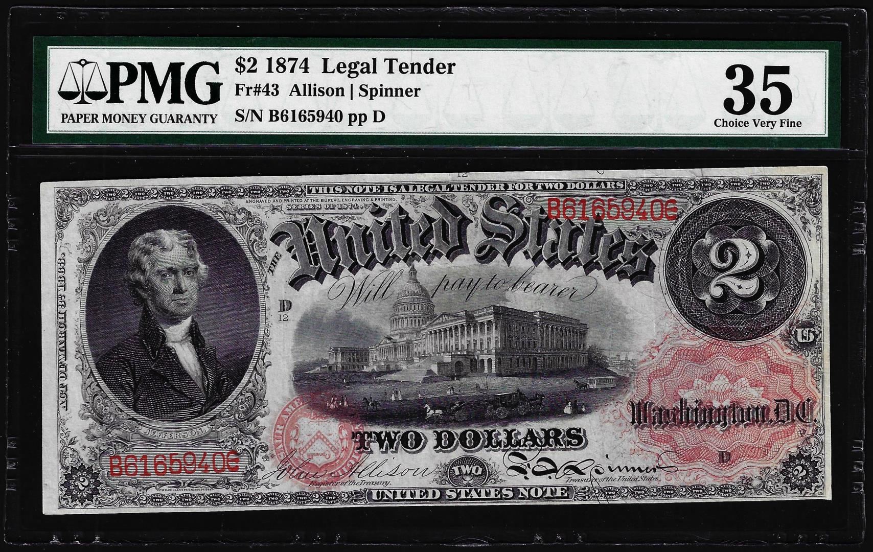One 1874 $2 Legal Tender Note Fr.43 PMG Choice Very Fine 35. PMG Certified.