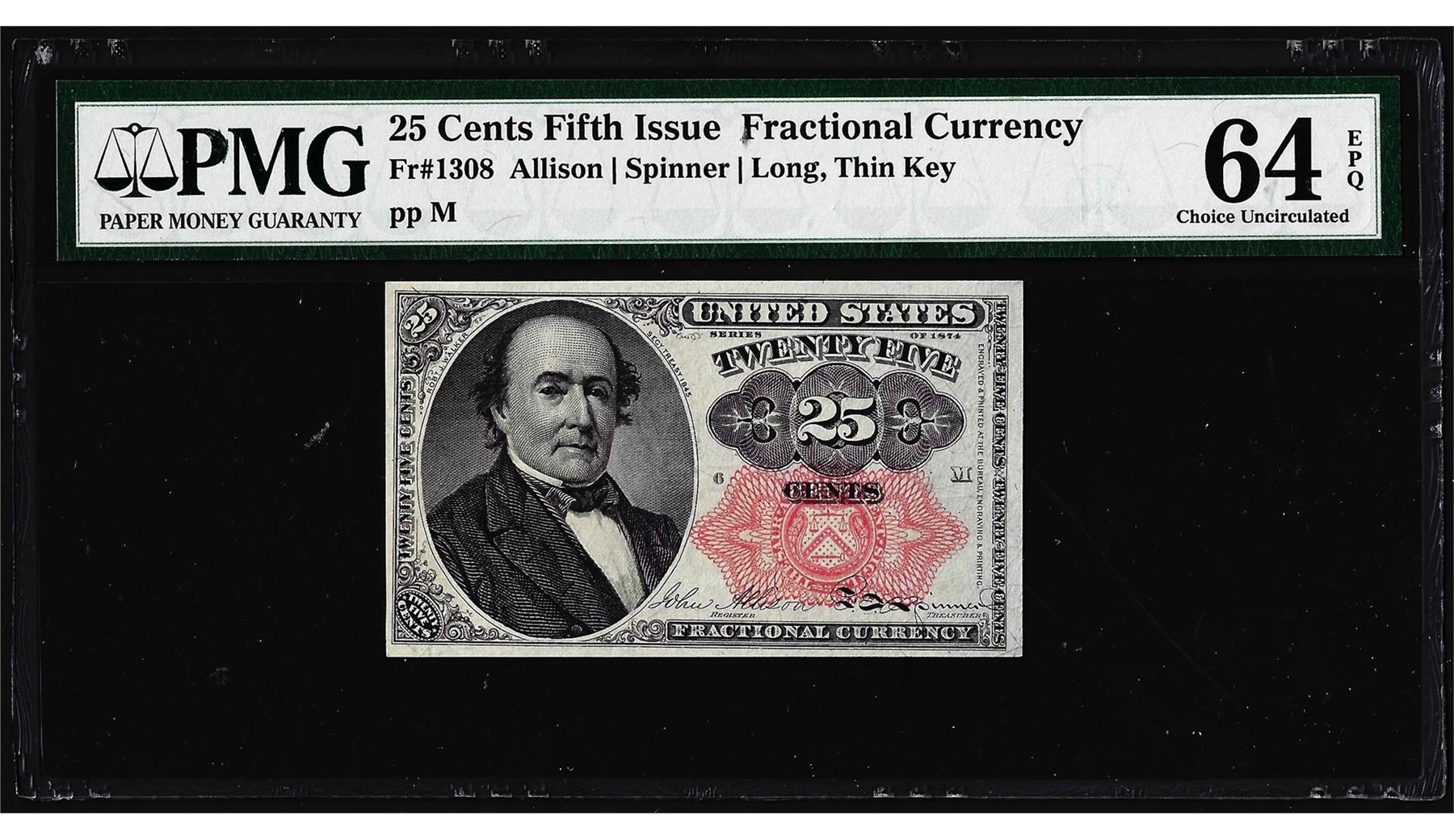 One 1874 25 Cent Fifth Issue Fractional Currency Note Fr.1308 PMG Choice Uncirculated 64EPQ. PMG Certified.