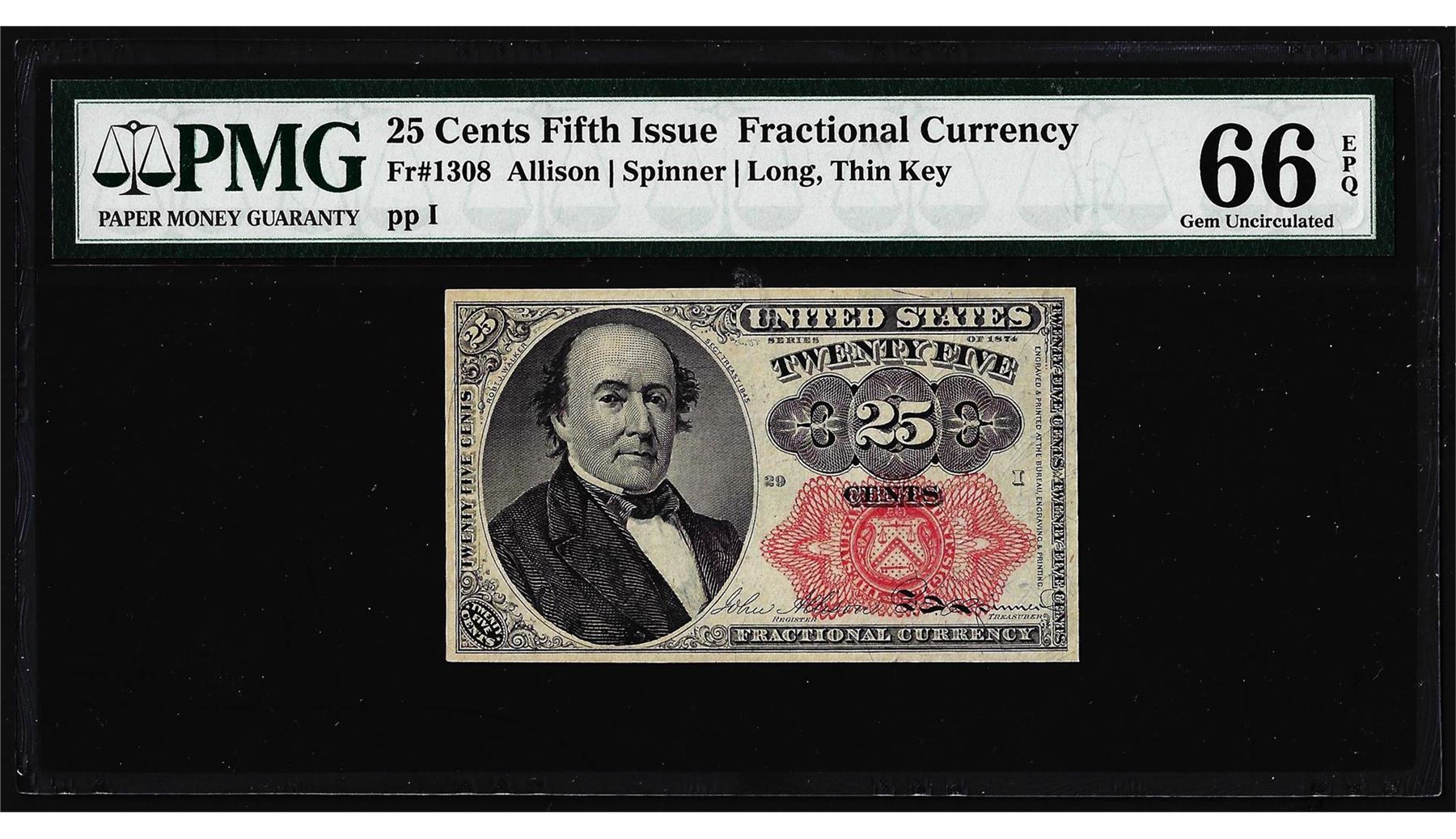 One 1874 25 Cent Fifth Issue Fractional Currency Note Fr.1308 PMG Choice Uncirculated 66EPQ. PMG Certified.