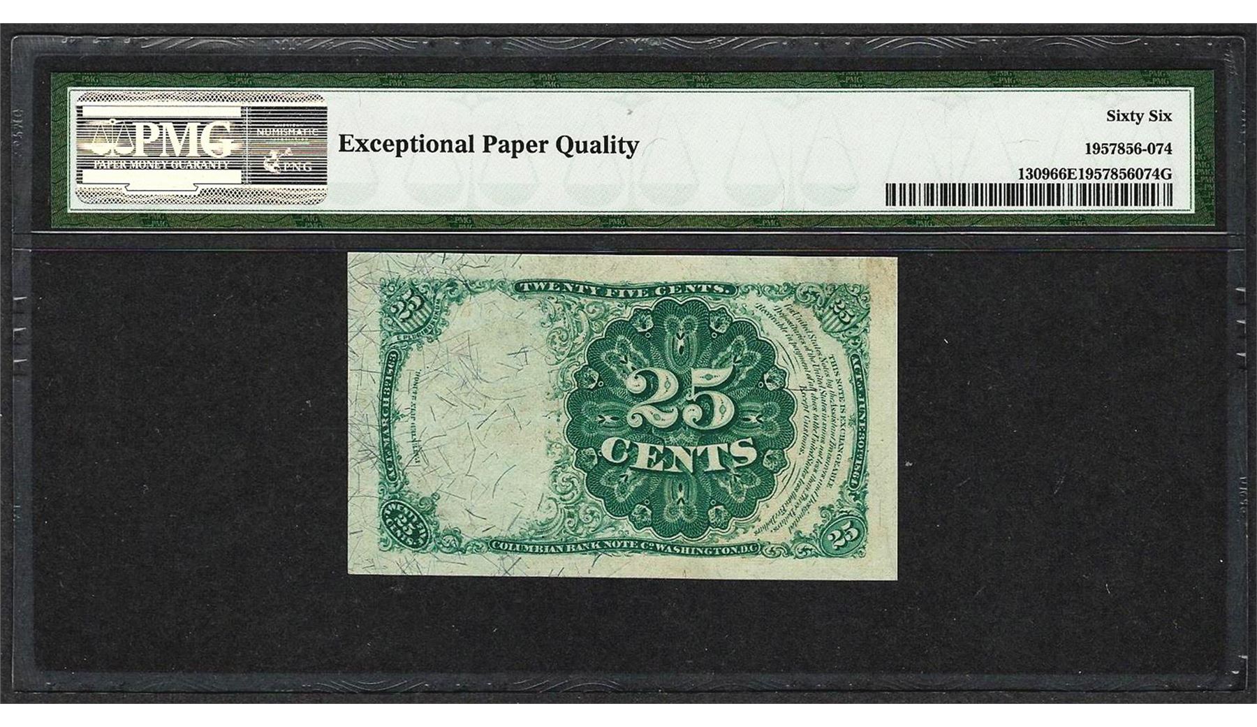 One 1874 25 Cent Fifth Issue Fractional Currency Note Fr.1309 PMG Gem Uncirculated 66EPQ. PMG Certified.
