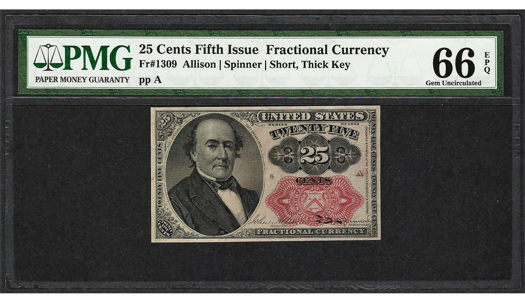 One 1874 25 Cent Fifth Issue Fractional Currency Note Fr.1309 PMG Gem Uncirculated 66EPQ. PMG Certified.