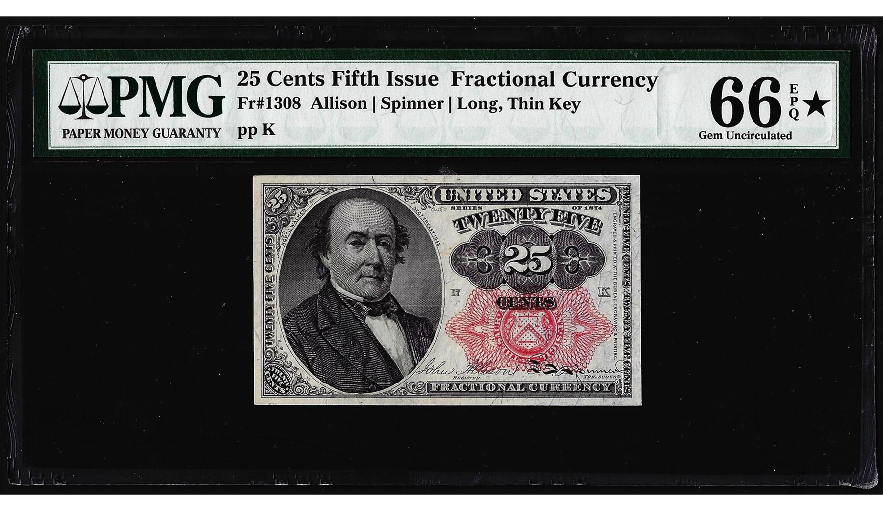 One 1874 25 Cent Fifth Issue Fractional Currency Note PMG Choice Uncirculated 66EPQ Star. PMG Certified.